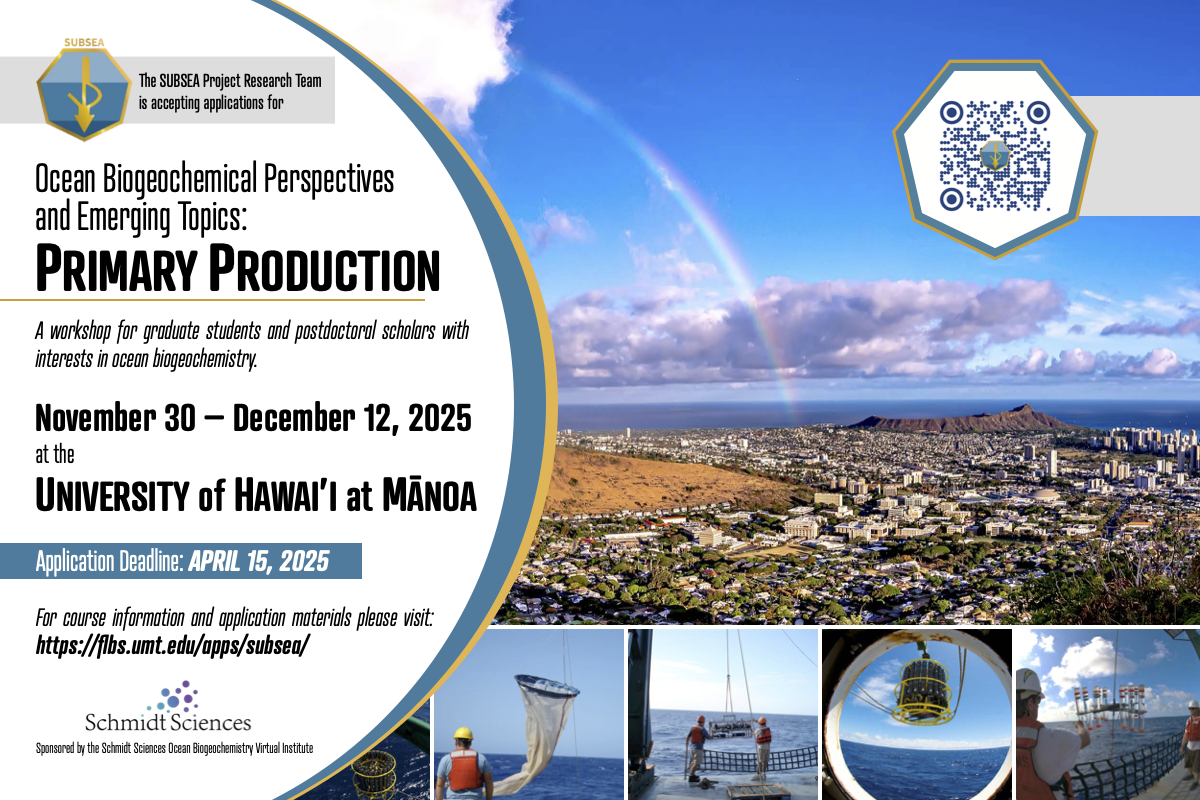 A 2-week workshop for OBVI graduate students and post-docs. Funding for this project is provided by the Schmidt Sciences Ocean Biogeochemistry Virtual Institute to the Subtropical Underwater Biogeochemistry and Subsurface Export Alliance (SUBSEA) program.